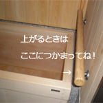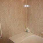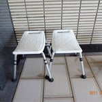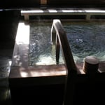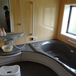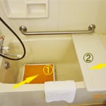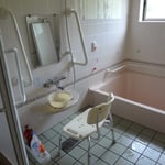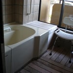 腰掛てから入れる浴槽です。湯船の中は、段があるので、上がるときは手伝ってもらいましょう。シャワーチェアーもあり。脱衣場に手すりがないので、いすの背もたれを支えにしてもらいました。