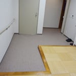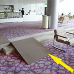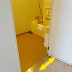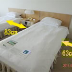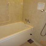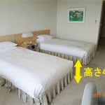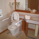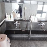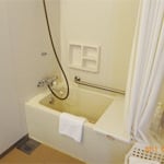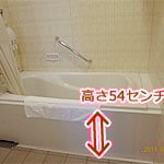 20年以上前に建てられたホテルだが、バリアフリールーム完備。浴槽の中の赤い台は、深さを調節するためのもの。バスボードを利用して、一旦腰かけてから入れるようになっています。